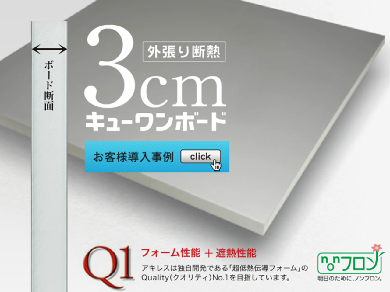 Q1ボードは、セルの微細化による初期値向上のほか経年変化を抑えることにより長期性能の向上も可能にした断熱材です。アルミシートによる遮熱効果も期待できます。